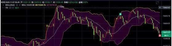 行情分析: 大餅早間一波沖高拉到15985附近遇阻,后續動能不足,開始震蕩回調,日間總體走勢維持在高位震蕩,現在運行在15410一線,從小時圖來看:布林帶縮口運行,K線運行在布林帶中軌.