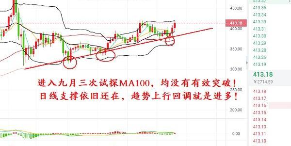 這也是行情的一個中線行情思路的布控,因為我們從日線的行情中就可以明顯的看到,七月份的以太坊正式出現單邊的上漲,行情的走勢就是一直在日線圖中MA100的支撐下一路上行,并沒有有效的破位這個位置,進入九月行情。以太坊的回調三次試探MA100均沒有有效的突破,那么行情的基本思路就是已經得到了確定,趨勢依舊是看漲無疑!這也是前期宸浩從378-375一路進行以太坊多單的布局的原因!我們在市場中操作,首先第一點就是確定好行情的整體大思路,大思路的趨勢之下進行布局中線的波段利潤,在波段行情收獲的同時,在區間的回踩中收獲區間的短線,這樣才是這個市場收獲的關鍵,正所謂入市不密市,認定市場的趨勢,才是市場中收獲的正確方法。