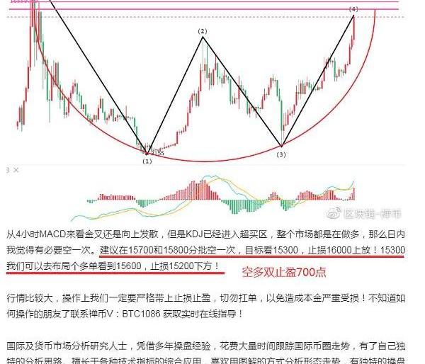 再來看下晚間的一個行情走勢,從4小時圖我們不難看出目前是一根針探頂上方高點,然后開始回落那么這種走勢我們就不得不懷疑這就是一個單針探頂的走勢,目前我們重點關注下方15300的支撐破位情況,如果說沒有破位那么上行通道依舊完整,如果破位那么行情還將持續下探,從附圖指標MACD來看,紅色動能開始縮量減弱,有漸漸形成死叉的趨勢,KDJ粘合向下發散。綜合來看禪幣認為還是會走一個下行的趨勢,所以操作上我們盡量已高空為主,低多為輔!