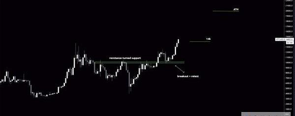 有趣的是,對比特幣價格而言,14,000美元比20,000美元更為重要。這是因為在$14,000左右有更多的交易量和價格,而不是對$20,000的歷史高位進行一次測試。20,000美元可能是心理阻力位,而14,000美元是可行的技術阻力位。