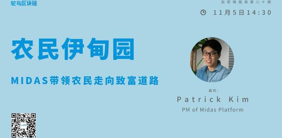 11月5日下午兩點半,MidasPlatform的產品經理PatrickKim做客鴕鳥區塊鏈加密情報局第80期,帶大家走進“農民伊甸園”,一起分享Midas是如何帶領農民走向致富道路的。