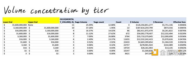 左邊的兩欄是我們試圖弄清信息整理的。FTX基本上將其交易量集中度分為11個等級,每個等級都是前一個類別的十進制對數,上限為300億美元。