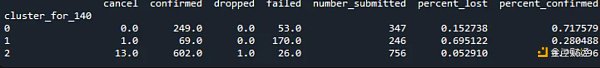 在項目 140 中,我們在 average_action_delay 或 total_actions 中沒有看到相同的動作差異,相反,我們可能看到相同的“加速”群體在非常晚的階段進入并設置遠低于平均水平的gas價格,如平均gas行為。綠色集群可能代表比橙色集群有更多經驗的用戶,但他們的行為仍在橙色和藍色之間轉換。如果我嘗試將其映射到 118 中的集群,我相信“加速”群體現在已成為進入較晚并發出低gas量的“貪婪”群體(橙色)。 “設置并忘記”群體很好地映射到“早搶”群體(綠色和藍色),因為他們都表現出很好的耐心和足夠的gas投標安全性凈值。