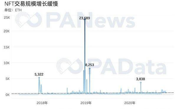 但是,從2017年以來的NFT市場交易情況來看,幣本位交易規模增長趨勢十分緩慢,即使今年下半年NFT概念被熱炒后,其整體幣本位交易規模也沒有表現出明顯的擴大。