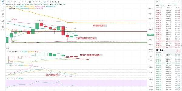 小時圖上看,布林帶兩端持平,行情目前在布林帶中軌下方位置運行,MA5均線拐頭向下,MACD空頭能量柱開始放量,快慢線死叉下行,KDJ三線死叉后向下發散。結合指標來看,目前行情走勢并不樂觀,上方壓力位在13500-13700,下方支撐點在13100-13300。