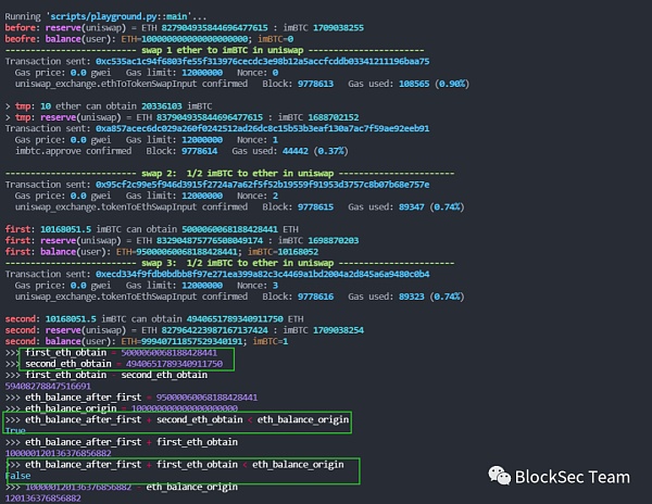 step 2: 將換得的 imBTC 分兩次(一次一半),向 Uniswap(imBTC) 換回 ETH(其中第二筆是重入所得),通過簡單的計算我們可以知道:0.611341052127704463 + 0.472375805535296596 = 1.0837168576630012 > 1?通過這種方式來薅羊毛