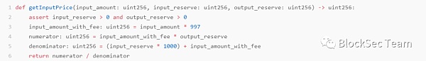 Uniswap 交易對合約中的交換函數(例如: ethToToken, TokenToToken...),原理基本一致,即保證交易池(交易對合約,后簡稱交易池)內兩種幣數量的乘積恒定(不考慮 Fee 的情況下[注1]),這些函數會先調用 getInputPrice 方法獲取可以購買的另一種代幣數量:
