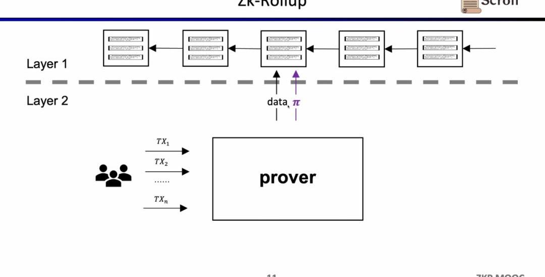 ZK-Rollup的架構中,L2網絡只需將數據和驗證數據正確性的證明上傳至L1,其中證明通過零知識證明電路計算而來。