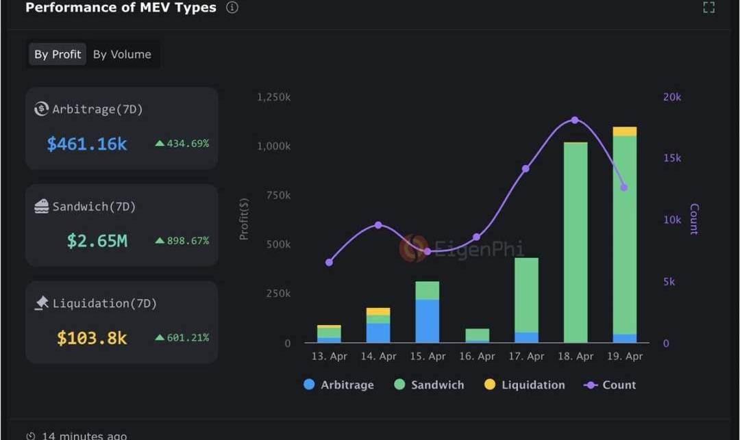 本質上,MEV促成了所有區塊鏈使用者展開了對于區塊空間使用權的爭奪。因此,在鏈上回暖的當下,MEV成為了許多搜索者的「提款機」。比如,在Memecoin風潮下,截止4月19日,七天內MEV所產生的利潤已經超過三百萬美元。