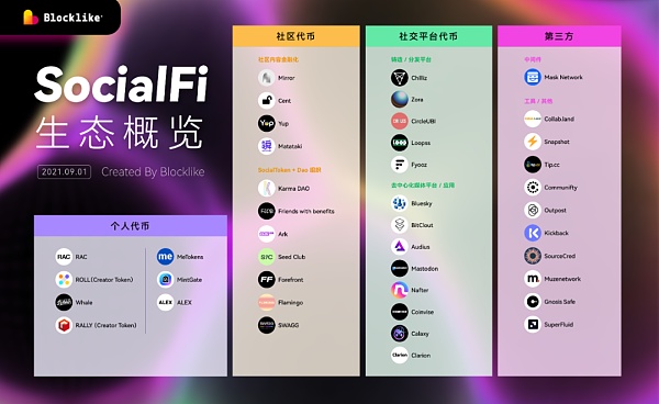 Blocklike 綜合多渠道公開信息進行整理,對 SocialFi 現有生態主要參與者進行梳理,展示社交代幣生態最新面貌。