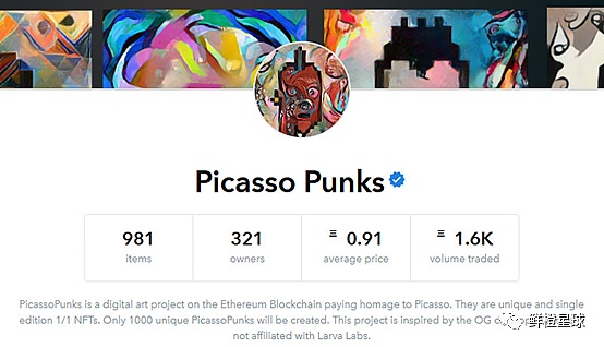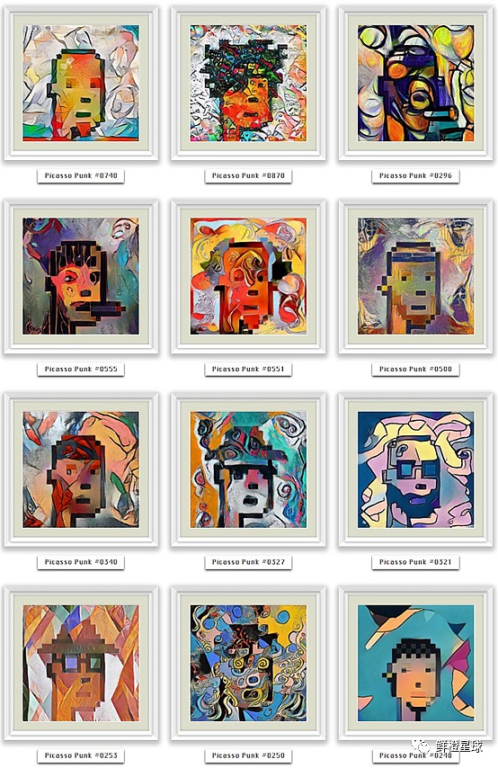 Fine Art Punk 也是比較早期的Punk衍生項目, 就是一位女畫家給一萬個Cryptopunk作畫, 完全首創, 靠個人硬核的畫技來為Punk增加藝術價值. 可惜沒怎么宣傳, 到現在也沒有被Opensea官方認可(verified). 她是最早用藝術的方式重新理解Punk的, 連晚幾周上線的Picasso Punk都是仿照她的 (第一個Punk幾乎一模一樣, 有抄襲的嫌疑). 后來啥梵高Punk, 達芬奇Punk, 莫奈Punk就更是跟風之流, 基本上就是一個濾鏡加在Punk上面然后撈錢。