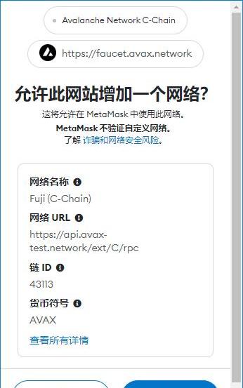 如果上述步驟里無法成功在小狐貍添加跳轉雪崩測試網,可以去Chainlist,連接錢包,勾選IncludeTestnets,搜索框搜索Fuji,檢索出來后選擇AvalancheFujiTestnet,再點擊AddtoMetamask,錢包里進行確認即可。