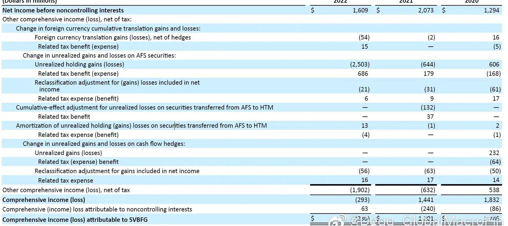 我們知道商業銀行買固收產品大多是以可供出售和持有至到期來做會計處理的。SVB也不例外。其160億的美債完全以AFS計量,而1000億的MBS主要是以HTM來計量。AFS和HTM的好處是,資產市值的波動不會直接反映在損益上,至多影響其他綜合收益下的未實現損益,而且可以轉回。但缺點是,一旦被迫出售AFS和HTM,就需要在當期確認一筆損益。
