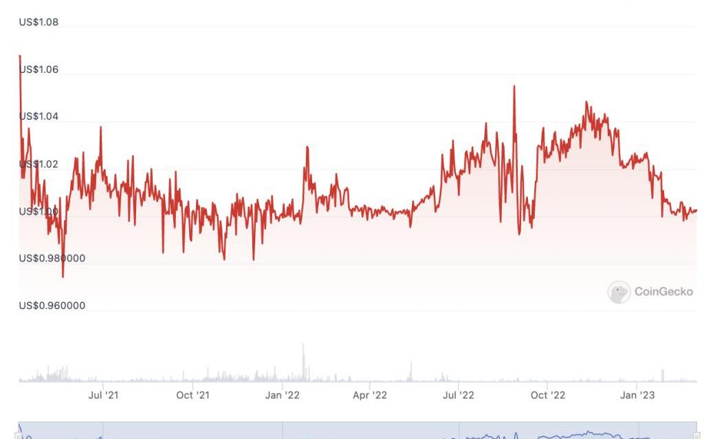 另一個老牌的去中心化穩定幣,由Synthetix發行的sUSD,選擇了價格的穩定性,在絕大多數時間內,sUSD的價格的波動區間都在1美元上下1%的區間之內波動,但是代價是極低的資金利用效率。