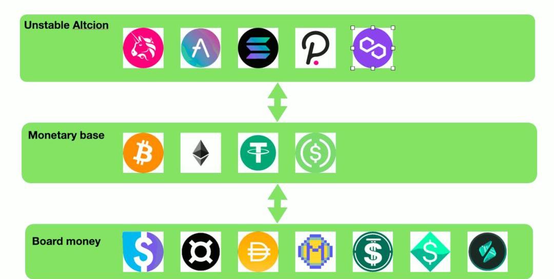 以此比喻,事實上,USDC、USDT就已經占領了穩定幣世界里的高能貨幣的職位。絕大多數依靠綁定高能貨幣提供流動性的穩定幣,其實只是提供類似傳統金融市場里的廣義貨幣。