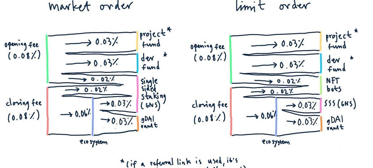 GNS的費用去向明細如下圖,考慮到市價單約占比70%,因此GNSStaking分成約為0.07/0.16x70%+0.03/0.16x70%=36.25%,gDAI分成約為0.03/0.16=18.75%。其中限價單中支付給NFTBots(執行機器人)的部分即是上一條推文中進入gDAIBuffer的部分。
