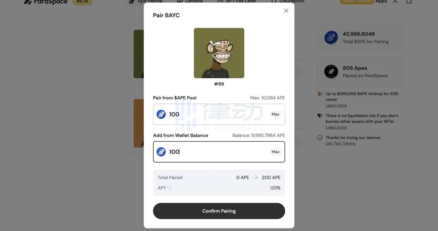 ?$APE質押者拿到的$cAPE可以在ParaSpace內部流通,BAYC/MAYC/BAKC等NFT的持有者可以選擇借入$cAPE進行在平臺內配對,即時NFT會與$APE在HorizenLabs上質押以獲得官方的最大質押獎勵;