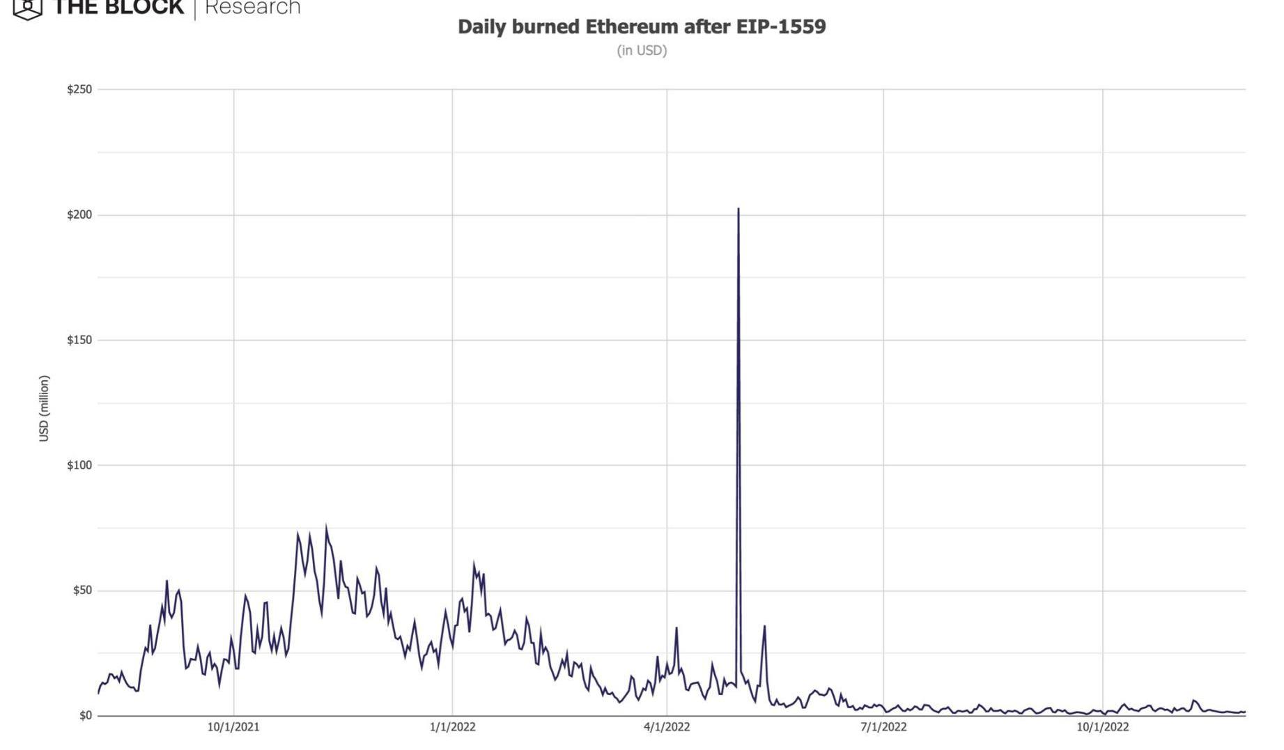 4、11月共銷毀了53,155ETH,相當于6,860萬美元。下圖中5月初的飆升是由Otherside土地NFT銷售引起的。自以太坊于2021年8月上旬實施EIP-1559以來,共銷毀了275萬枚ETH,相當于87.3億美元: