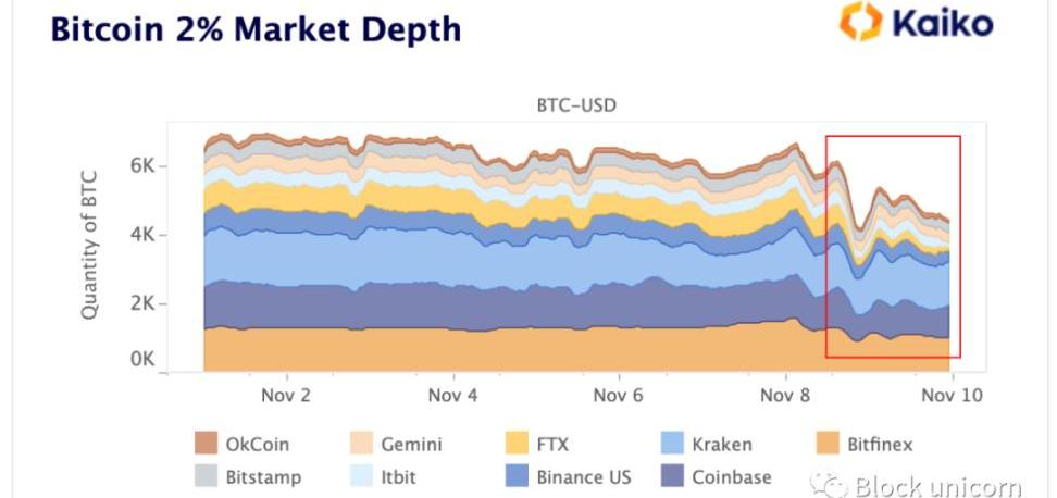 Alameda的破產可能已經影響到流動性,在過去的兩天里,BTC-USD訂單上的比特幣數量從所有市場的約6000個下降到4000個。