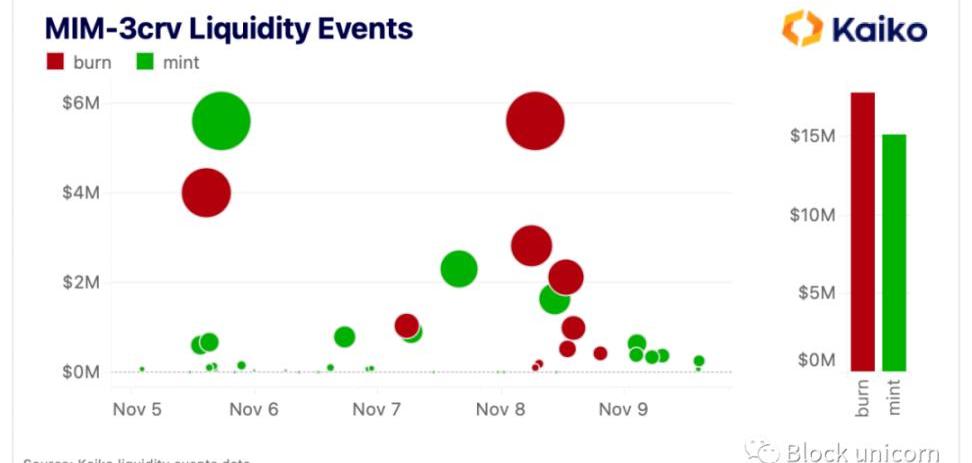 這種影響也已經蔓延到了以太坊。人們很快意識到,FTT是抵押穩定幣MIM的一個主要支撐。鏈上調查顯示,其中大部分是Alameda的頭寸,當FTT達到6美元時,它將被清算。在這個消息中,MIM的掛鉤開始動搖,盡管該團隊很快宣布,它正在與Alameda合作,以減少他們的貸款規模。隨后,MIM回到了穩定的掛鉤,并沒有看到其CRV池強烈資金流出,過去幾天的MIM銷毀量只比鑄造多一點。