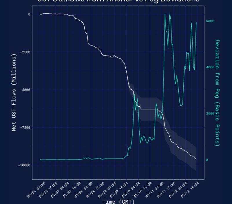 下圖說明了隨著UST從Anchor的撤出,UST與美元的掛鉤偏差越來越大。