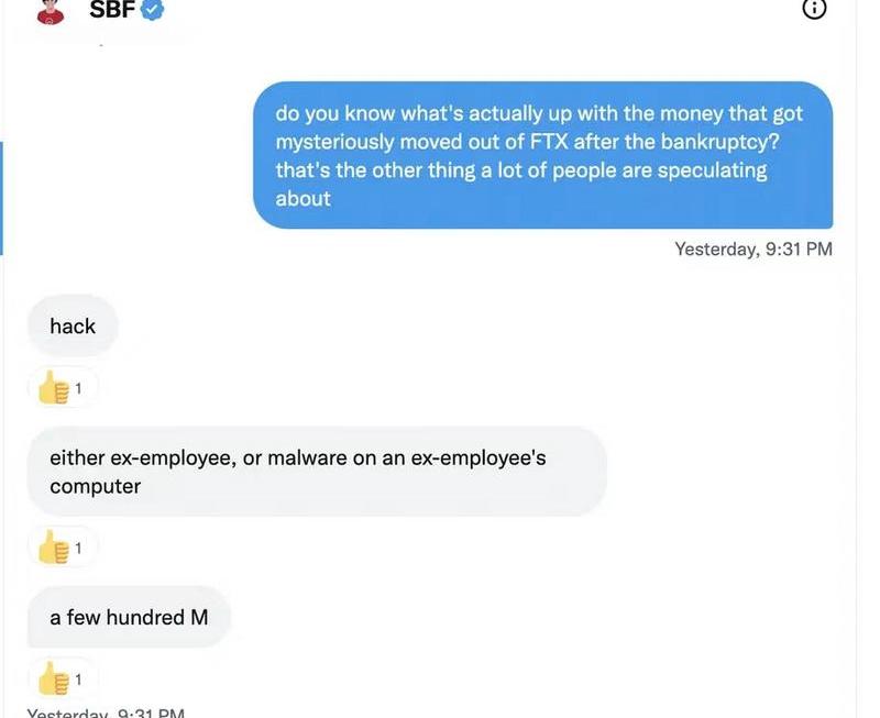 在FTX申請破產后不久,關注區塊鏈交易的用戶注意到有人將數億美元轉移出了該公司。我問SBF發生了什么。他回復是FTX被黑客入侵了,而這件事情要么是前員工干的,要么是前員工電腦上的惡意軟件造成的,有幾百個惡意軟件在操作。