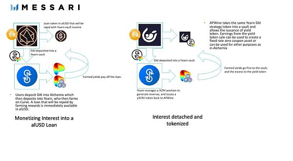 Alchemix是首個了解到這些農場未來的超額產量在當前具有未開發價值的協議。該協議從Yearn的DAI(現在是ETH)金庫中獲取收益農場獎勵的預期現值,并用它來抵押其alUSD穩定幣或alETH的貸款。