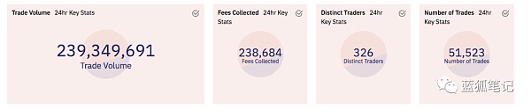 跟Perpetual一樣,dYdX也是DeFi衍生品交易平臺。兩者永續合約的交易量在DeFi領域位居前列。按照寫稿時過去24小時的交易量看:dYdX的交易量大約為6.23億美元,交易訂單數超過13萬,未平倉合約頭寸超過1.9美元。Perpetual的交易量大約為2.39億美元,交易筆數大約5.1萬筆,當天協議捕獲費用為23.8萬美元。