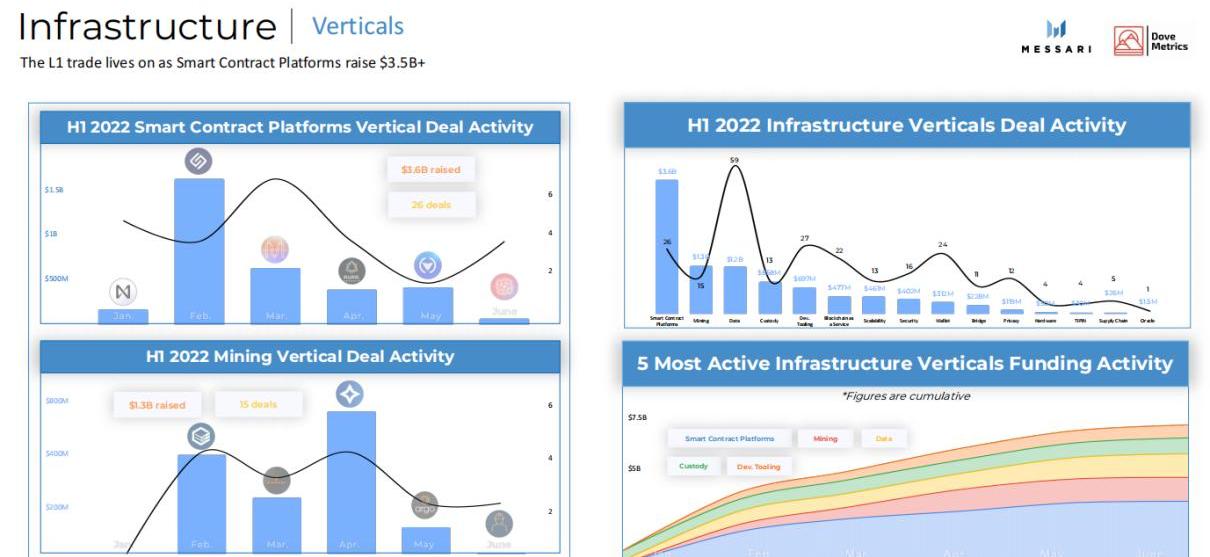 基礎設施領域上半年發生投融資事件252起,共籌集了97億美元的資金,規模僅次于CeFi。其資金總量環比增長131%、同比增長246%,披露的投融資事件環比增長129%、同比增長84%。基礎設施獲投項目從融資輪次的階段來看與CeFi頗為相似,早期148起、A輪43起、后期61起,且63%的項目總金額超過500萬美元、43%的項目總金額超過1000萬美元。其中,智能合約平臺融資總量為36億美元,是資本押注力度最大的項目類型,在所有賽道的垂直領域中位列第一,其他熱門的項目還有數據、托管、挖礦等。