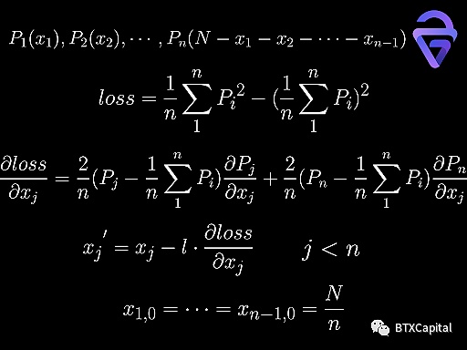 因此,我們引入了一種在機器學習等領域常用的技術,稱為梯度下降。我們將損失函數定義為不同價格函數值的方差。在選擇一個起始猜測(一個簡單的、不知情的猜測可以是每個池中的交易量相等 N/n)后,我們可以迭代(通過損失函數相對于該變量的偏導數改變每個交換量,乘以學習率 l) 以獲得最佳結果,在一定的誤差接受范圍內。