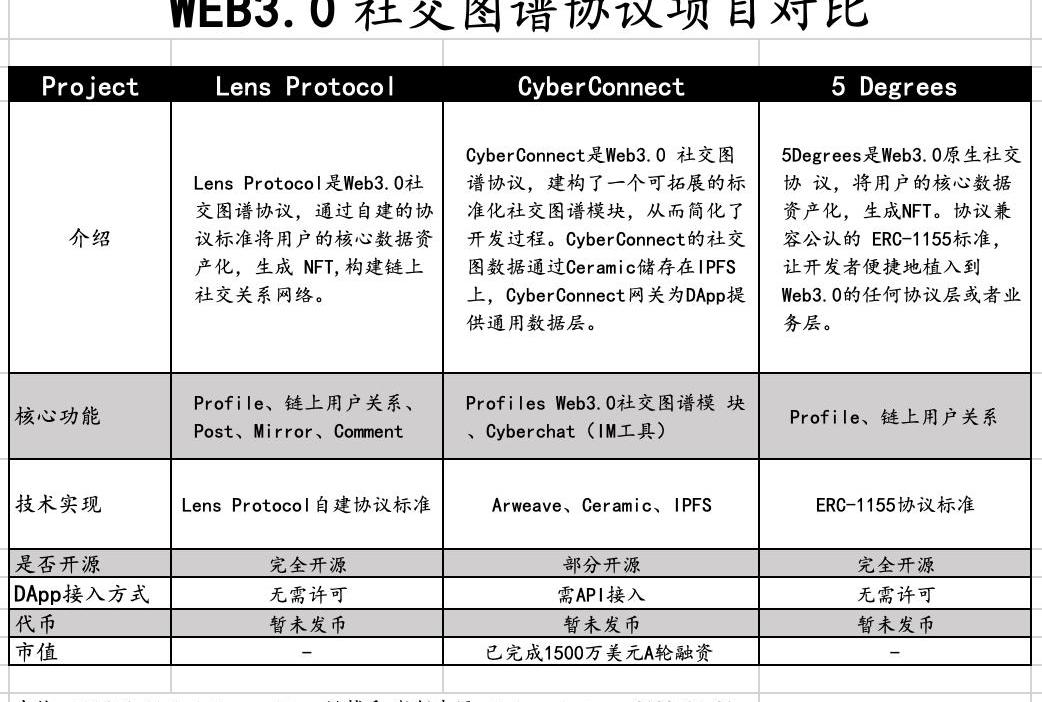 社交圖譜賽道中的熱門項目包括CyberConnect,LensProtocol,5Degree基本總結如下: