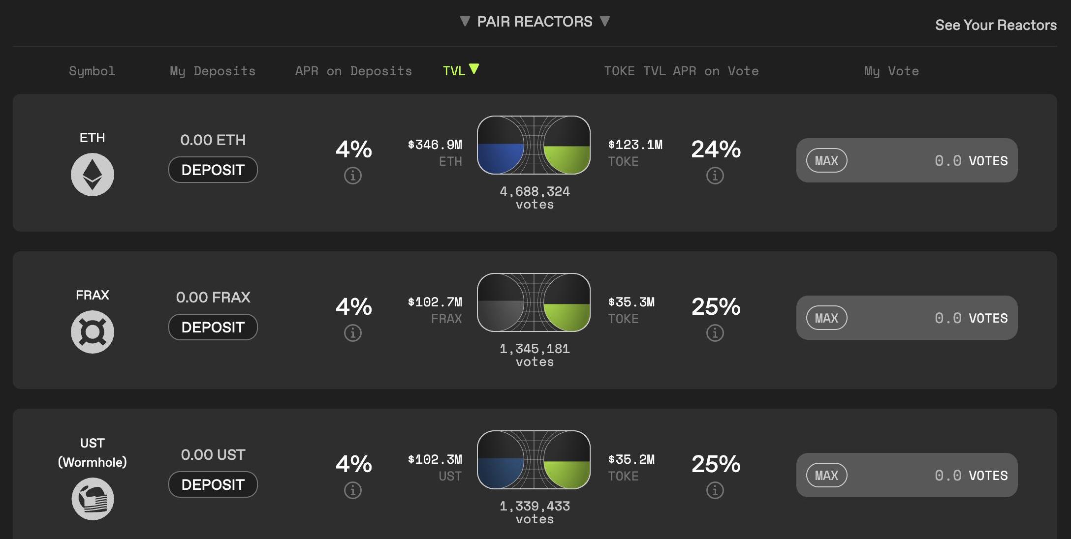 Tokemak上每一種需求流動性的資產都有自己的一個TokenReactors,流動性提供者將對應代幣投入TokenReactors以賺取TOKE收益。目前正在運行的TokenReactors有8個,對應8種加密資產。