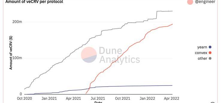 Convex也通過對CRV/cvxCRV代幣的流動性挖礦激勵,使兩者在DEX的兌換比例十分接近1:1,借此也為用戶在獲得并提升了可以從Curve平臺獲得收益的同時,還保留的充足的流動性。Convex也借此機制,獲得了大量的veCRV,從而獲得了非常充足的對Curve上各流動性池激勵分配的投票權。Curve生態項目,包括Convex,對veCRV治理權的競爭,也被業界稱為CurveWar,不過基于當前數據來看,Convex已經獲得了43%的veCRV,在這個戰爭中占據了主導地位。