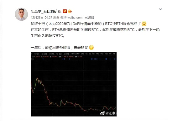 那么你就把 BTC 換成 ETH,或者 DeFi 龍頭(Uniswap+AAVE)就好了啊。比如大家熟悉的江卓爾,就是這么干的,而且高調的在微博上公開了,時間點正好是 2020 年底,什么叫高認知且知行合一,說的就是這類人群了。