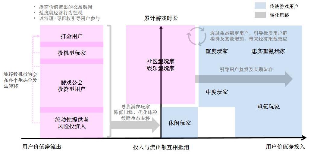 應改變傳統玩家分類思路,正視P2E游戲領域充斥著ROI驅動型玩家的現象,并充分認清用戶慣性造成的資金外流風險,通過社群/身份認同/可玩性等需求的滿足引導其成為生態價值貢獻者。