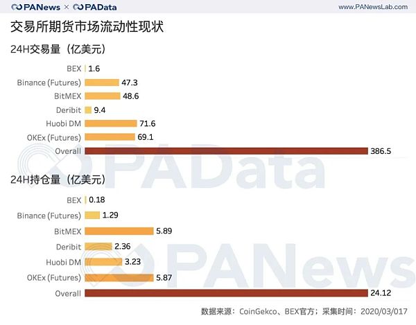 從流動性來看,期貨市場近一個月的交易量有了很大的躍進。根據3月17月CoinGekco的截面靜態數據,28家交易所24小時交易總量突破了386.5億美元,而2月12日這一數值只有275.33億美元,漲幅高達40%。其中,Huobi DM和OKEx的24小時交易量都突破了50億美元,BEX也達到了1.6億美元。