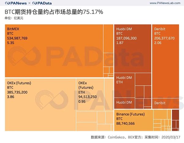 雖然交易量上漲了,但是近一個月受比特幣突然下跌影響,持倉總額反而下跌了。3月17日的數據顯示,28家交易所24小時未平倉頭寸累計約24.12億美元,而2月12日這一數值約為64.47億美元,跌幅約為62.59%。其中BitMEX和OKEx的持倉量超過5億美元,Binance和Deribit的持倉量均跌至3億美元以下,BEX的持倉量約為1800萬美元。