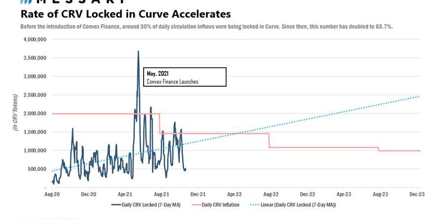 由于veCRV是不可轉讓的非流動性代幣,因此CRV的鎖定大大減少了其流通供應量。在撰寫本文時,大約有3.5億個CRV代幣在Curve上被投票鎖定,平均期限為3.7年,約占總發行量的42%。CRV代幣的這種高鎖定率部分歸功于2021年5月推出的ConvexFinance。