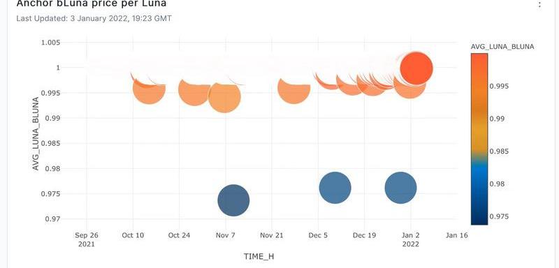 由于bLUNA不僅代表了所持LUNA的價值,還代表了21天鎖倉期所持LUNA的區塊獎勵,其價值始終高于LUNA。如下圖所示,在Anchor上,bLUNA的價格在大多數時候略低于1,三個不同的異常值顯示bLUNA在0.97的比率下更有價值。