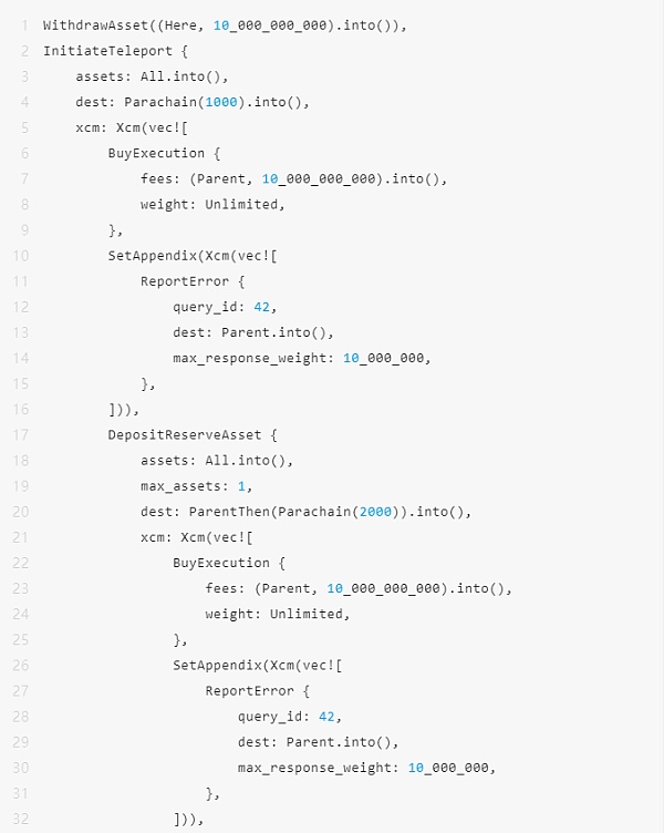 正如您所看到的,唯一的變化是引入了兩個 Set Appendix 指令,確保 Statemint 和 parachain 2000 中的錯誤或缺乏錯誤將報告給中繼鏈。這假設中繼鏈已經設置為能夠識別和處理來自 Statemint 和 parachain 2000 的 Query Response 消息,查詢 ID 為 42 ,權重限制為 1000 萬。令人高興的是,這確實是基板支持的東西,但超出了范圍。