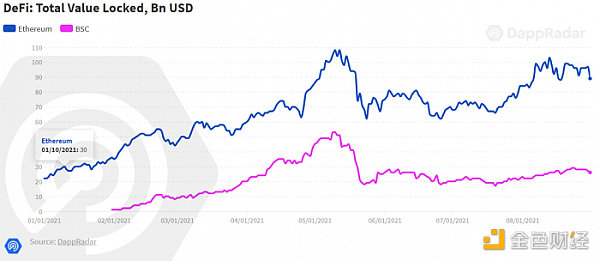 BSC 網絡中用于 DeFi 目的的主要資產是?BNB?(WBNB),從 2021 年初到 5 月中旬基本上呈現增長態勢(雖然期間出現幾次波動),但之后出現下滑,目前供應量已經較 5 月水平下降了約 33%。