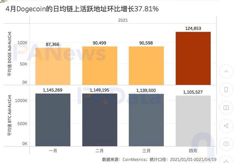 從用戶規模上看,4月Dogecoin的日均鏈上活躍地址數突破10萬個,達到12.49萬個左右,約為同期比特幣網絡日均鏈上活躍地址數的1/9。盡管Dogecoin和比特幣在活躍地址的絕對數量上仍存在較大差距,但與今年比特幣網絡日均活躍地址穩中有降的趨勢不同,Dogecoin的日均活躍地址有較快增長,4月日均活躍地址數較上月均值環比增長了37.81%。