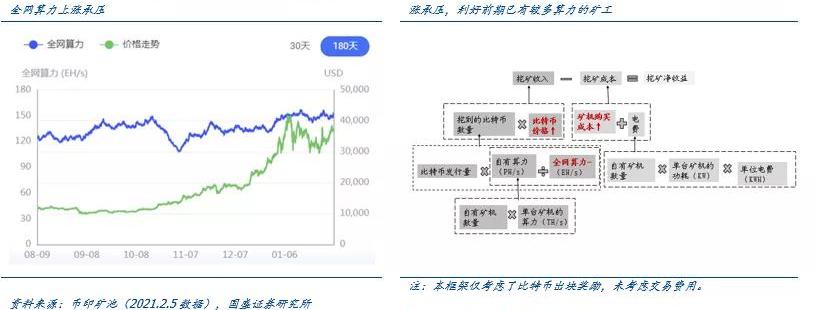背景:幣價上漲,礦機芯片產能受限,利好前期已有較多算力的機構。幣價上漲對挖礦收入的影響并非線性的“幣價漲—收入增”,要注意的是,1)收入端,礦工可挖得的比特幣數量與“自有算力/全網算力”正相關。幣價上漲時,理論上全網算力增加,但去年以來,礦機芯片產能受半導體需求緊張,全網算力增加緩慢,因此礦工“自有算力/全網算力”不減,即礦工可挖得的比特幣數量不減,利好礦工;3)成本端,由于礦機廠商以回本周期定價,幣價上漲時,回本周期縮短,礦機提價,挖礦成本上升,挖礦凈收入增加承壓,利空礦工。因此,我們認為,短期內挖礦形勢利好前期已有較多算力儲備的機構,而礦機廠商加碼挖礦也將成為行業有力競爭者。