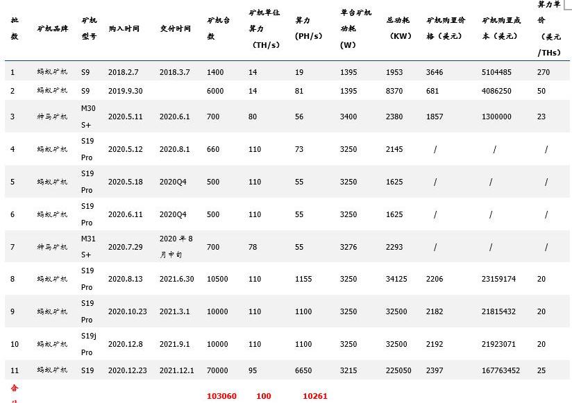 2020年5月,訂購1000個M30s礦機進行自營的比特幣挖礦業務,稱在2020年的目標是最新的500PH/s,這一收購將提高大約90PH/s。ASIC挖礦技術。這一部署將為現有的機群增加大約90P。