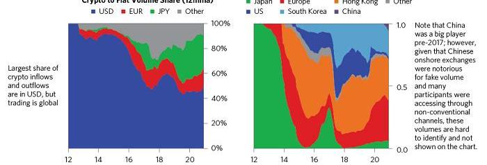 另一方面,由于高頻交易者的出現,繁榮的衍生品市場、以及與比特幣進行交易的其他代幣數量激增,近年來比特幣交易額激增。再加上不受監管的加密貨幣交易所報告交易量數據存疑,也給市場造成了流動性增加的錯覺。