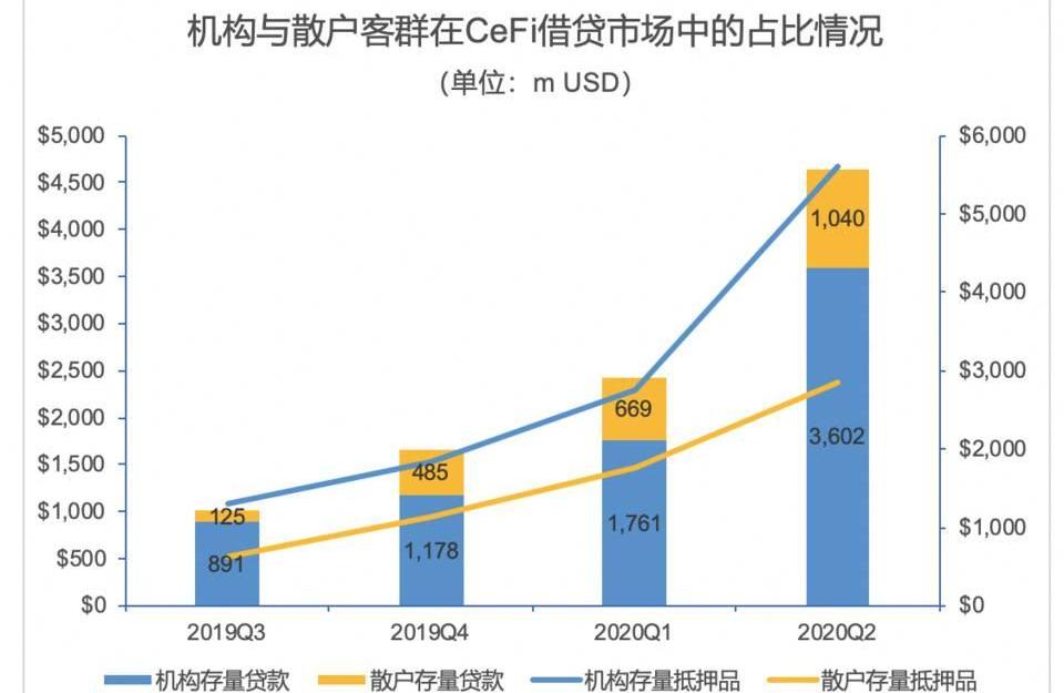 機構客戶在CeFi借貸市場占據了主導地位。2020年第二季度,機構與散戶的存量貸款比為3.5:1;同期的機構與散戶抵押品價值比為2:1。從存量貸款與抵押品價值的比值差異中可以發現,機構客戶在質押率上確實有著非常明顯的優勢。