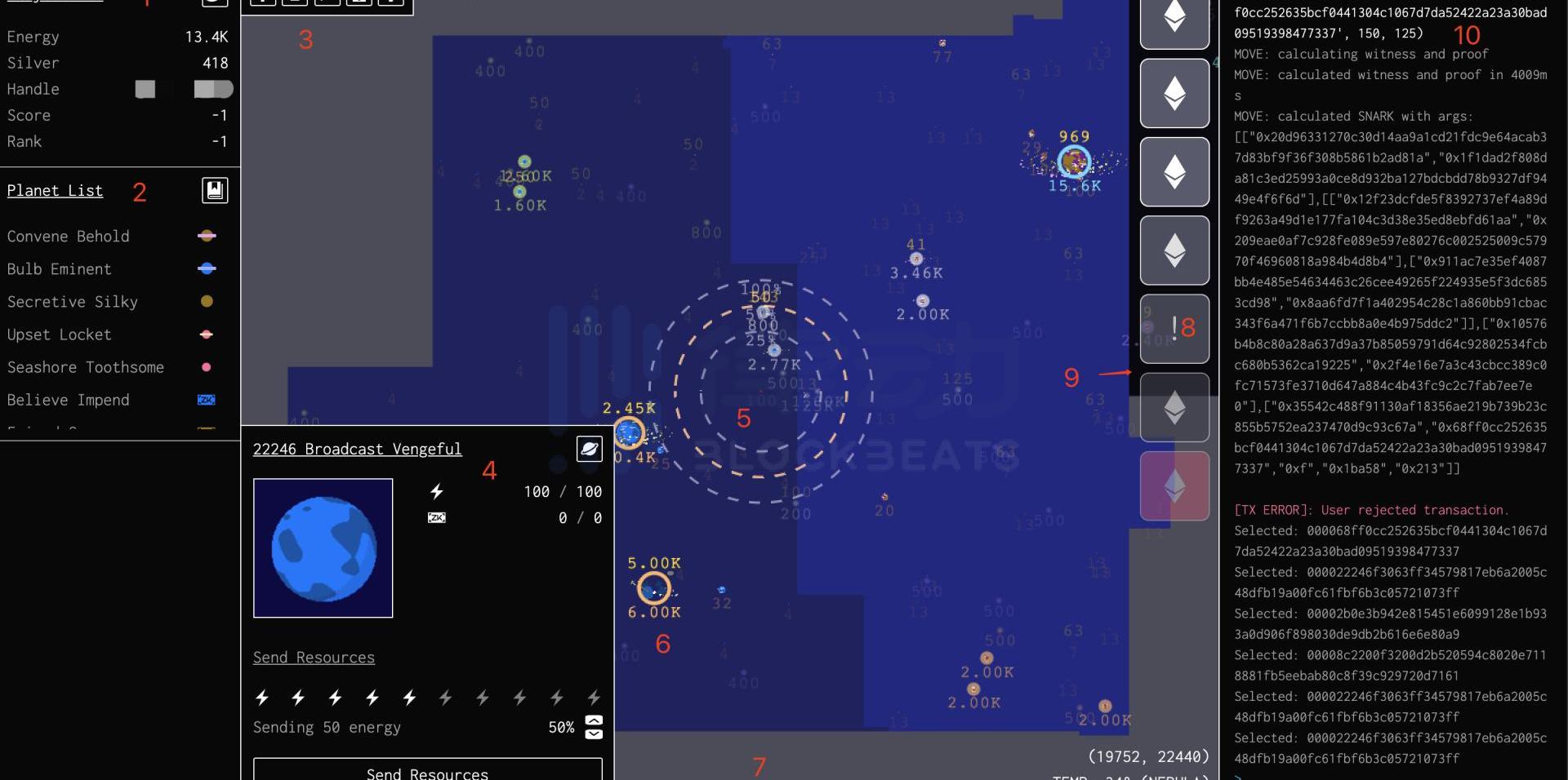 9:深空。游戲的區域分為「星云」、「太空」、「深空」。圖中依次顯示為深藍、淺藍、黑三種不同的顏色。所有玩家都在星云中出生,星云也是宇宙中最安全的地方。深空中包含更稀有和更強大的行星,但更容易受到其他玩家的攻擊。