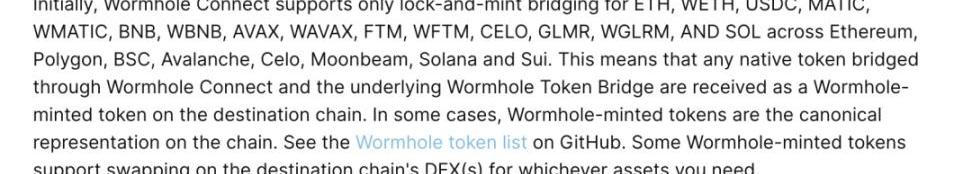SuiToken跨鏈橋現已上線,用戶可將22個Wormhole支持的資產直接跨鏈至Sui網絡。最初,WormholeConnect支持跨以太坊、Polygon、BSC、Avalanche、Celo、Moonbeam、Solana和Sui之間跨鏈的資產為:ETH,WETH,USDC,MATIC,WMATIC,BNB,WBNB,AVAX,WAVAX,FTM,WFTM,CELO,GLMR,WGLRM,SOL。