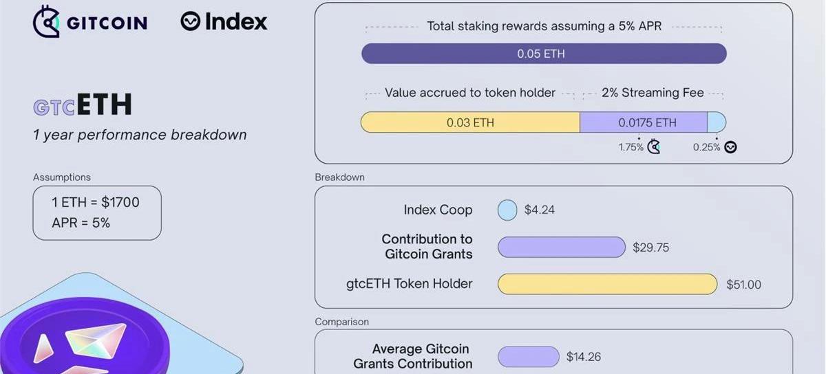 GitcoinStakedETH指數(gtcETH)是一種指數代幣,以太坊流動性質押代幣組成,旨在支持以太坊上的公共產品融資。gtcETH使用IndexProtocol構建,與其他IndexCoop產品使用相同的基礎設施。該代幣目前由44.1%的rETH、29.9%的WrappedstETH和26%的sETH2組成。它通過2%的年化費用為Gitcoin產生收入,其中大部分流向Gitcoin,為公共物品提供了穩定的資金來源,作為GitcoinGrants的“再生”補充。