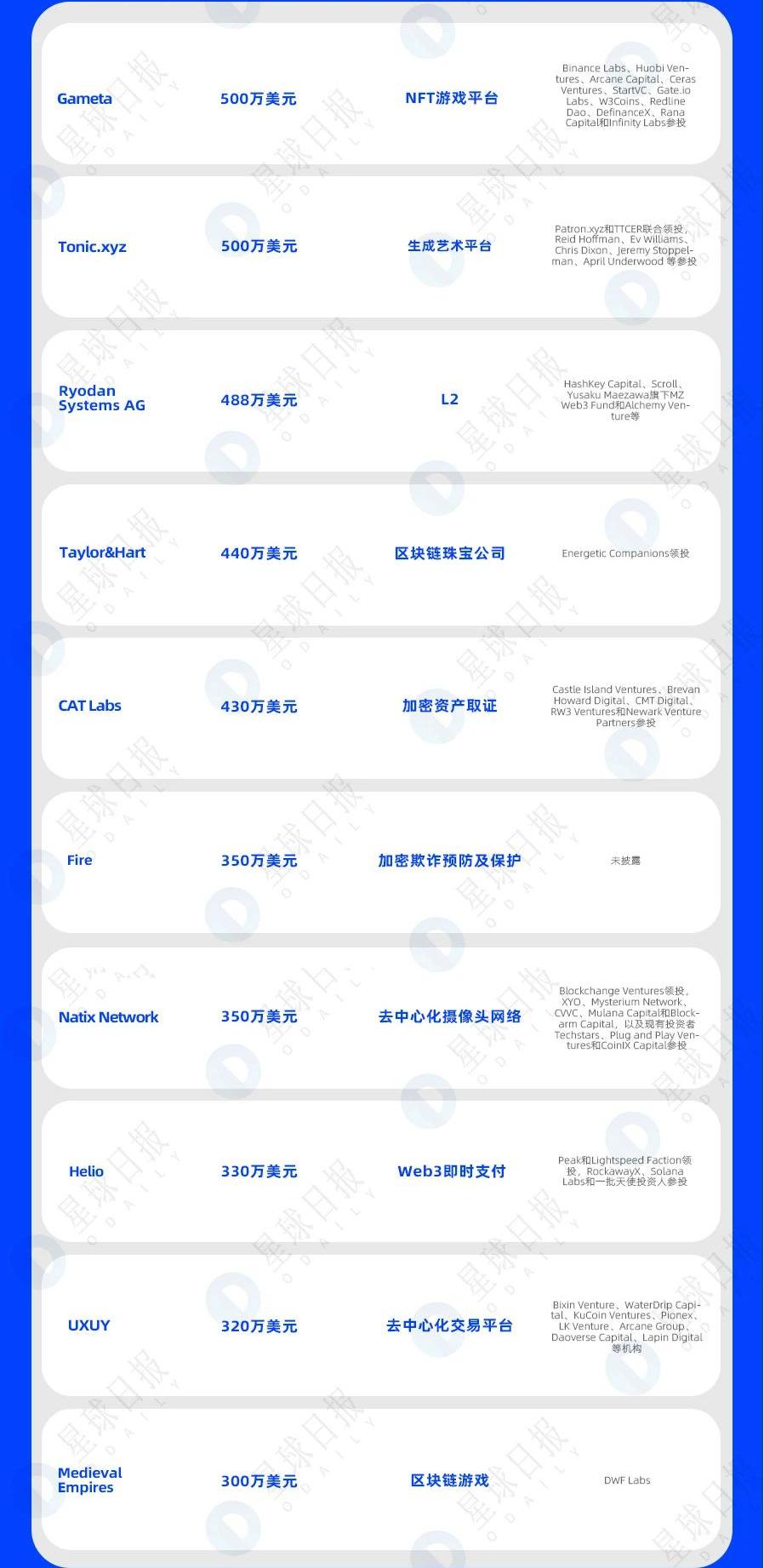 EOSNetwork獲DWFLabs的6000萬美元投資4月14日,數字資產做市商和投資公司DWFLabs宣布通過4500萬美元的EOS代幣購買協議和1500萬美元的投資承諾來支持EOS網絡,以投資基于EOS的企業和項目。該承諾旨在加快EOS網絡的擴展和接受度。據悉,此次合作的時機非常有利,因為EOS網絡將于4月14日推出其企業級EOS以太坊虛擬機(EVM),其性能超過Polygon、BSC和Avalanche,每秒交易次數超過四倍。SeiNetwork以8億美元估值完成3000萬美元融資,JumpCapital、DistributedGlobal等參投4月11日,SeiNetwork宣布以8億美元估值完成3000萬美元融資,本輪資金將用于開發與亞太地區市場推廣,此前,Sei于2022年8月籌集了500萬美元的種子輪融資。新一輪的投資者包括JumpCapital、DistributedGlobal、MulticoinCapital、AsymmetricCapitalPartners、FlowTraders、HypersphereVentures和BixinVentures。據悉,Sei仍處于公測階段,計劃在今年晚些時候推出主網。9月,Sei啟動了5000萬美元的生態系統和流動性基金,以支持其平臺上的新DeFi應用程序,有超過120個項目建立在其區塊鏈上。Sei表示,其最新的公共測試網在3月中旬不到一個月的時間內吸引了約360萬獨立用戶,并處理了超過3500萬交易。Tradier完成2460萬美元B輪融資,PEAK6StrategicCapital領投4月14日,提供加密貨幣零售交易的金融服務公司Tradier宣布完成2460萬美元B輪融資,PEAK6StrategicCapital領投,此前曾投資過該公司的PrimeCapital和KFBusinessVentures參投。Tradier的全功能平臺支持加密貨幣、股票和期權交易,用戶能在TradierBrokerage和加密賬戶之間無縫導航,該公司計劃利用新資金擴大產品范圍、拓展API、以及提升全球借記融資、期貨和加密貨幣細分市場。Web3游戲開發公司MPL旗下MayhemStudios融資2000萬美元,紅杉資本領投4月11日,印度P2E游戲開發公司MobilePremierLeague旗下工作室MayhemStudios宣布完成2000萬美元融資,紅杉資本領投,SteadviewCapital、Truecaller等參投。MPL上個月推出了NFT市場GoodGameExchange,同時還啟動了基于P2E的Web3游戲戰略并將其作為集團發展計劃的一部分。零知識證明Layer2CryptoGPT完成1000萬美元融資,DWFLabs領投4月10日,零知識證明Layer2CryptoGPT宣布以2.5億美元估值完成1000萬美元融資,DWFLabs領投,新資金將用于在全球范圍內發展其開發團隊,并在亞洲市場建立區域影響力。RSS3通過向DWFLabs出售Token完成1000萬美元融資4月11日,RSS3通過向DWFLabs出售Token完成1000萬美元融資,RSS3旨在成為區塊鏈技術與人工智能、搜索引擎和社交媒體之間的橋梁,最新投資是在其推出RSS3AIOP之后進行的,RSS3AIOP是一種人工智能培訓環境,可為ChatGPT等機構提供Web3信息。據悉,RSS3之前獲得來自Coinbase、Dragonfly以及前AndreessenHorowitz合伙人BalajiSrinivasan的投資。這是DWFLabs在不到兩個月的時間里第十次至少1000萬美元級別的投資。Brassica完成800萬美元融資,MercuryFund領投4月11日,金融基礎設施技術公司Brassica宣布完成800萬美元融資,MercuryFund領投,ValorEquityPartners、LongJourneyVentures、NGCFund、Neowiz、BroadhavenVentures、ArmynCapital、VC3DAO、AlphaAssetManagement等參投,截止目前該公司的融資總金額已達到1200萬美元。據悉,Brassica主要為私人投資和數字資產行業提供服務,在傳統金融和Web3創新之間提供安全無縫過渡,其機構級解決方案使數字資產投資更加合規和安全。Web3關系管理平臺WRM開發商AbsoluteLabs完成800萬美元種子輪融資4月11日,據官方消息,Web3錢包關系管理平臺WRM開發商AbsoluteLabs宣布完成800萬美元種子輪融資,AglaéVentures、AlphaPraetorianCapital、TheLuxuryFund、NearFoundation、MoonPay、PlassaCapital、PunjaGlobalVentures、SamsungNext、SparkleVentures和W3i參投,新融資將用于擴大業務。據介紹,WRM是一款Web3CRM解決方案,用戶包括LVMH、TheSandbox、Moonpay和Mocaverse。破產索賠交易平臺Xclaim完成700萬美元的A輪融資4月11日,破產索賠交易平臺Xclaim已完成700萬美元的A輪融資。Xclaim允許交易主要的破產債權人債權,包括FTX、Genesis和BlockFi。Xclaim表示,自2018年開始運營以來,它已經列出了超過10億美元的索賠,交易量超過2億美元,有500名注冊投資者。NFT及數字藝術社交平臺HUG完成500萬美元種子輪融資,OKXVentures參投4月12日,NFT及數字藝術社交平臺HUG宣布完成500萬美元種子輪融資,Web3投資基金DIGITAL領投,OKXVentures、歐萊雅旗下BOLD企業風險基金、Venrex、JaeHoldings、Cryptology、Samara和AaSons等參投。據悉,HUG于2022年2月推出,創始人是Facebook創始人馬克·扎克伯格的姐姐蘭迪·扎克伯格,該平臺幫助藝術家銷售數字和實物商品,并與數字藏家建立聯系,新資金將用于加速HUG產品增長,并將平臺商業功能與現有社交管理和發現工具進行整合。Web3NFT游戲平臺Gameta完成500萬美元種子輪融資,BinanceLabs等參投4月10日,Web3NFT游戲平臺Gameta宣布完成500萬美元種子輪融資,BinanceLabs、HuobiVentures、ArcaneCapital、CerasVentures、StartVC、Gate.ioLabs、W3Coins、RedlineDao、DefinanceX、RanaCapital和InfinityLabs參投。自2022年成立以來,Gameta已經擁有超過700萬鏈上用戶。該項目目前在BNBChain上活躍用戶中排名第一,同時是BinanceLabs的MostValuableBuilder孵化營獲獎者。在其最新NFT游戲HippoDash中,Gameta保有超過40%的用戶留存率。圍繞其游戲體系,Gameta建立了讓用戶可以進行游戲、社交、經驗共享以及Web3資產互動的HippoClubNFT系統。通過HippoClubNFT,Gameta希望降低準入門檻以讓每個用戶都獲體驗到NFT的文化、金融和娛樂價值,以此讓HippoClub系列成為大眾版的“BAYC”。Gameta將使用本次融資加快其游戲生